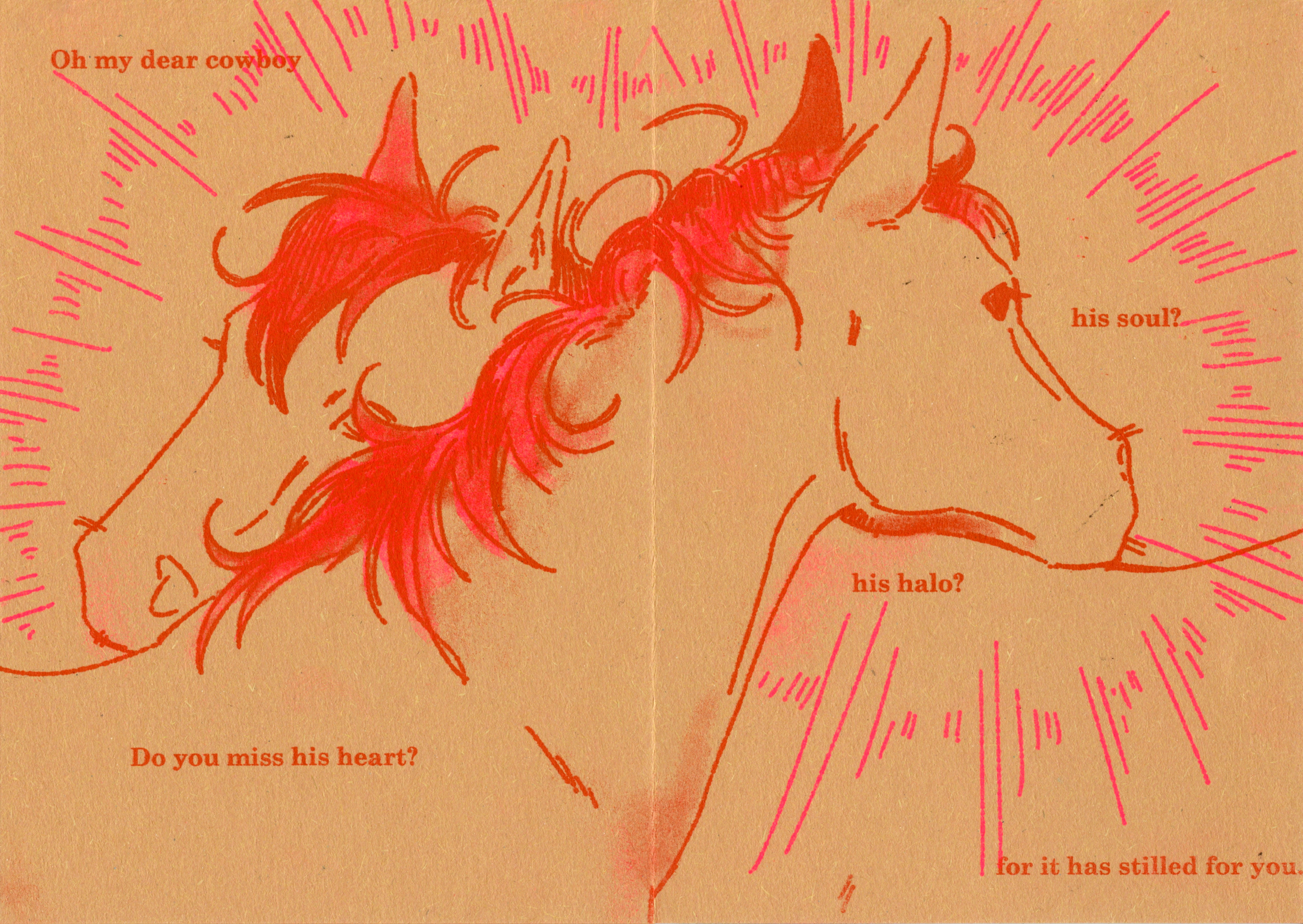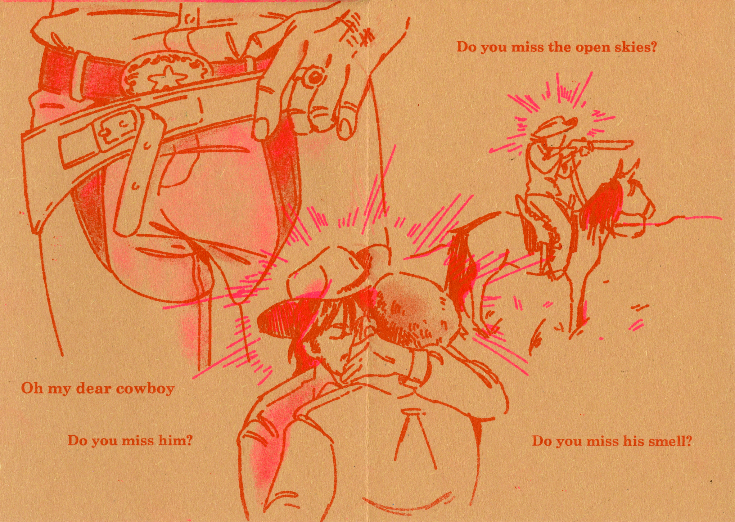The Cowboy is a short two colour risograph zine. It is a sort of love letter to cowboys, as I've developed a real affection towards cowboys and their place in the queer world and queer history.